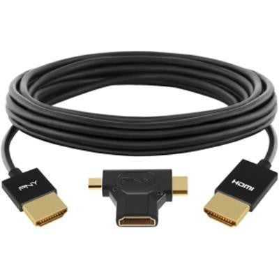 12FT 3-in-1 Smartphone/Tablet Themed Packaging With the PNY 3-in-1 12ft HDMI kit it's never been easier to bring your content to the big screen. Share your photos and videos with your family and friends in seconds. There aren't many portable devices that feature a standard HDMI connection. Most devices use a "mini" connector and some use its smaller counterpart the "micro" connector. The PNY 3-in-1 12ft HDMI kit is the complete digital imaging solution; featuring a 12ft Smart Active High Speed HDMI cable and a combination mini/micro-HDMI adapter. The 12ft Smart Active High Speed cable employs a thin, flexible design which makes it much easier to handle than typical HDMI cables. Plus, the HDMI Mini/Micro adapter makes for easily connecting directly to your digital camera, smartphone or tablet.