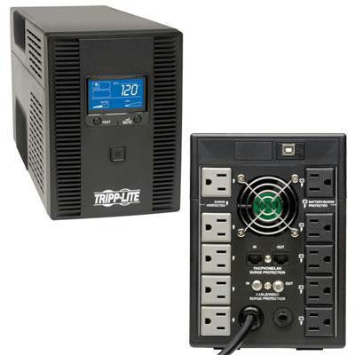 1500VA UPS LCD Battery Back Up Tower AVR 120V USB Coax RJ45. OMNI1500LCDT. Tripp Lite's OMNI1500LCDT Line-Interactive Tower UPS System offers voltage regulation, surge suppression and long-lasting battery support for personal computers, network workstations, home entertainment systems and media centers. Internal UPS circuits support entry-level PCs or individual VCR/DVR components during power failures. Prevents data loss, viewing interruptions, lost recordings and loss of component programming. Automatic Voltage Regulation (AVR) circuits continuously regulate brownouts and overvoltages from 92V to 150V back to usable levels, all while maintaining a full battery charge. Offers complete power protection in an attractive all-black cabinet design. Includes 10 built-in outlets, 5 with full battery backup and surge suppression for vital system components and another 5 with surge-suppression only for accessories not requiring battery support. Built-in USB port and included cable enables optional unattended system shutdown without data loss in case of extended power failure. PowerAlert software is available via free download from www.tripplite.com. HID-compliant USB interface also enables integration with built-in power management and auto shutdown features of Windows and Mac OS X. Built-in surge dataline surge suppression jacks protect equipment with single-line dialup/DSL or network Ethernet connection. Built-in audible alarm and large LCD front panel display offers easy to read icon-based status indicators and detailed numeric data regarding input voltage, output voltage, frequency, load percentage, load watts, battery voltage and runtime in minutes. 1500VA/810W power-handling capacity supports entry-level PCs, home entertainment systems, network workstations and audio/video components.