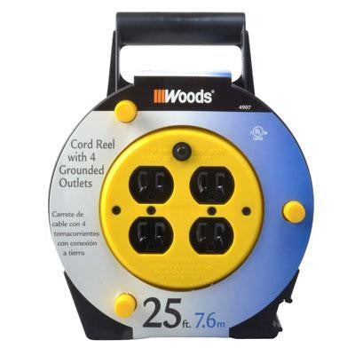 4907 - 16/3 25' SJTW BLACK CORD REEL. Cord Reel Features: Circuit breaker and power indicator light, 4 handy grounded outlets, 25 ft. 16/3 SJT black extension cord included,10 Amp circuit breaker, Power indicator light, Black case with yellow hub