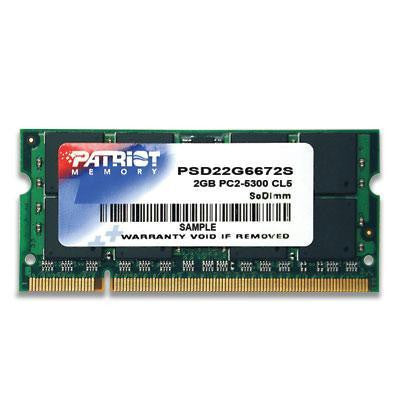 2GB 667MHz DDR2; "Patriot's 2GB Signature SODIMM memory delivers a high performance and quality upgrade solution for DDR2 based notebook computers*. It has been tested at 667MHz with a CAS Latency of 5. Patriot ensures that every module meets or exceeds the industry standard and offers lifetime warranty. * Compatible with notebook computers using Intel Core 2 Duo or AMD Turion 64 X2 processors."