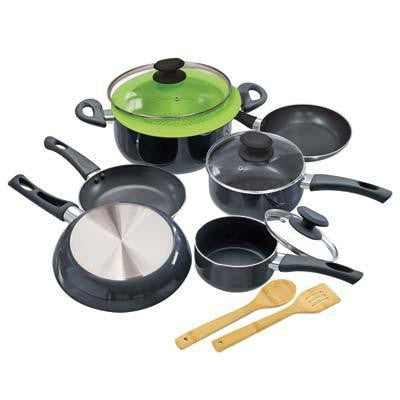 Cook well and Do Good with this Ecolution Eco-Friendly 12 Pc. Elements aluminum Cookware Set. Keep cool handles are comfy to grip and stay cool. Oven safe to 350 degrees F. Pure aluminum insures consistent heating--even heating equals happy eating. Non-stick Hydrolon coating is an ecologically advanced water based coating that is made without PFOA for fewer greenhouse gases. Glass lids let you see what's cooking without letting heat escape. Dishwasher Safe. Set includes: 8" Fry Pan, 9-1/2" Fry Pan, 11" Fry Pan, 1 Qt. Saucepan with Glass Lid, 2 Qt. Saucepan with Glass Lid, 5 Qt. Dutch Oven with Glass Lid, Collapsible Silicone Steamer, Bamboo Spoon and Bamboo Spatula. Packaging printed on 70% recycled materials