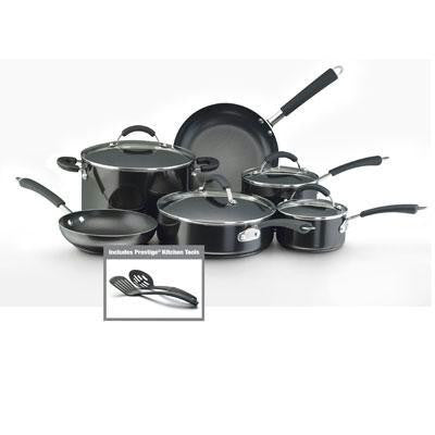 Millennium 12-piece Non-Stick Cookware Set in Black Aluminum gives you an excellent value by including the basic pans needed to equip your kitchen. It includes three different sized saucepans for whisking a homemade sauce or cooking your morning oatmeal, a big stockpot for soups, stews or pasta, and a large saute for everything from seared tuna to vegetable saute. This set also includes two Prestige kitchen tools to let you get started on your next culinary creation. Includes: 1 Qt. and 2 Qt. Covered Saucepans, 6 Qt. Covered Stockpot, 3 Qt. Covered Saute, 8'' & 9.5'' Skillets, two Prestige kitchen tools including a Slotted Spoon and Slotted Turner